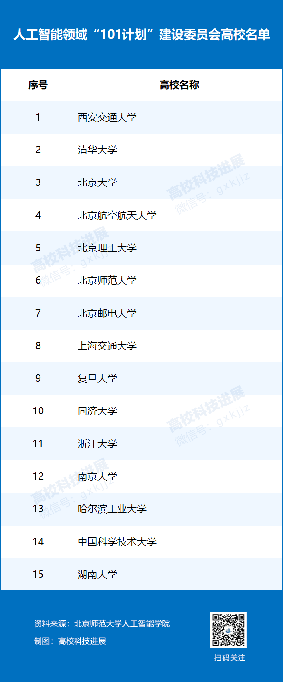 人工智能领域“101计划”建设委员会的15所高校分别是:西安交大、清华、北大、北航、北理、北师大、北邮、上海交大、复旦、同济、浙大、南大、哈工大、中科大、湖南大学。