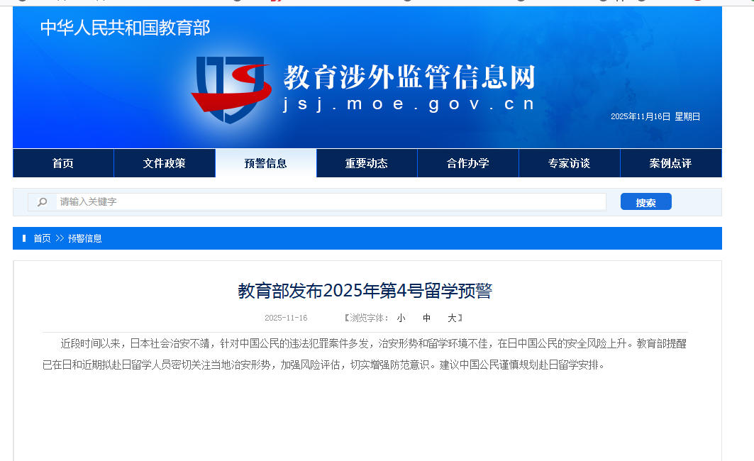 中新网11月16日电 据教育部教育涉外监管信息网消息,教育部发布2025年第4号留学预警。