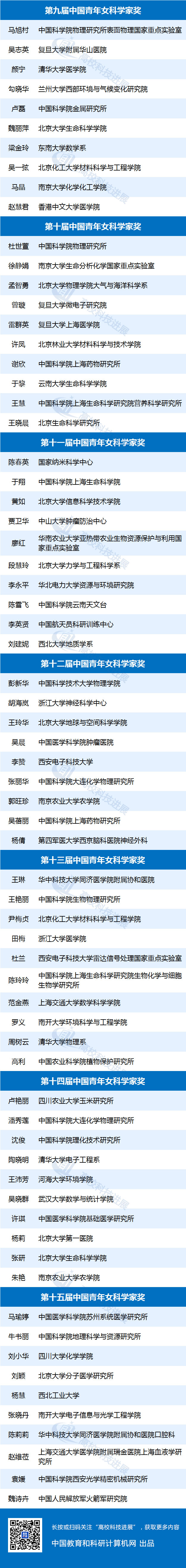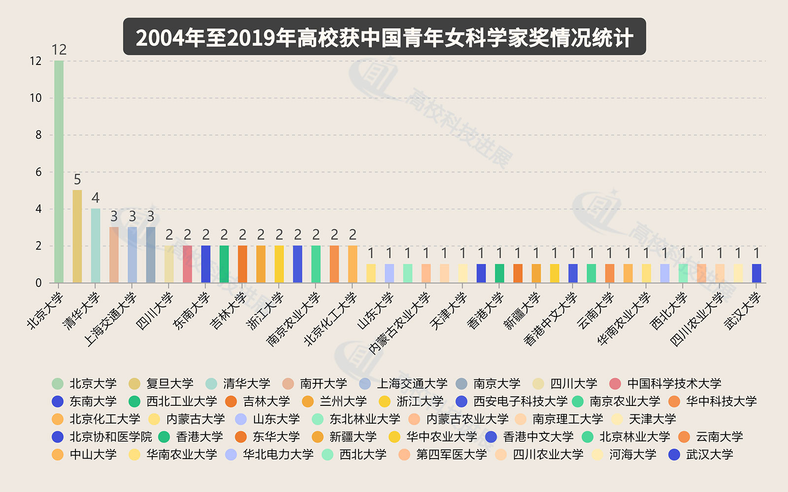 这15年来,高校中北京大学贡献了最多的中国青年女性科学家,共12名,包括北京大学生命科学学院吕植、北京大学临床肿瘤学院王洁、北京大学城市与环境学院胡建英、北京大学环境科学与工程学院胡敏等人。