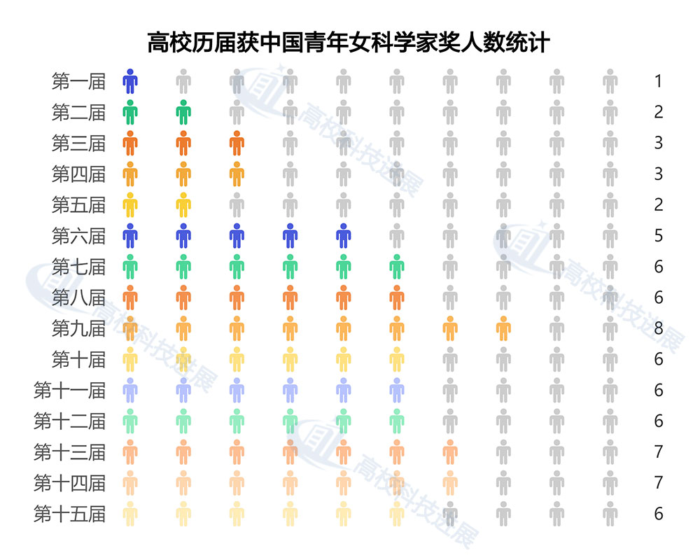 根据数据统计,高校获“中国青年女科学家奖”人数逐年增多,自第七届开始,获奖人数稳定在6人以上。可以看到中国杰出女性科学家人数在逐渐增多。