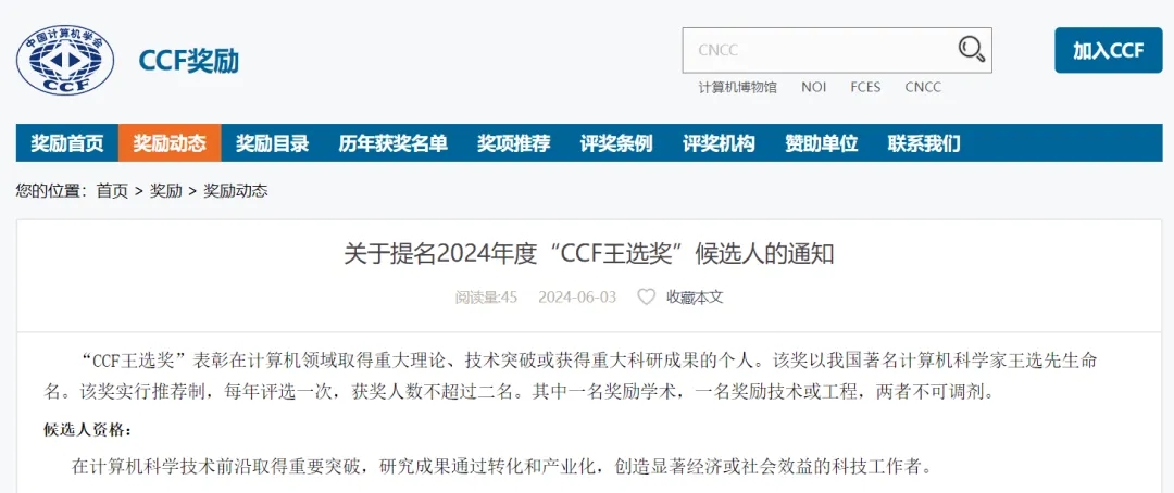日前,中国计算机学会官网发布《关于提名2024年度“CCF王选奖”候选人的通知》,提名工作启动,提名截止日期为7月15日。