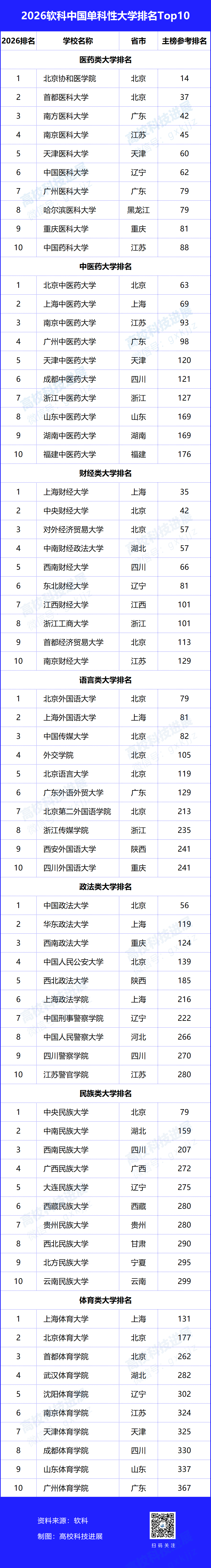 2026软科中国大学排名遵循分类排名的原则,对单科性大学使用差异化指标体系分别进行排名。其中,北京协和医学院蝉联医药类大学排名榜首,北京中医药大学摘得中医药大学排名桂冠,上海财经大学位列财经类大学排名之首,北京外国语大学占据语言类大学排名第一,中国政法大学问鼎政法类大学排名冠军,中央民族大学高居民族类大学排名首位,上海体育大学持续领跑体育类大学排名。