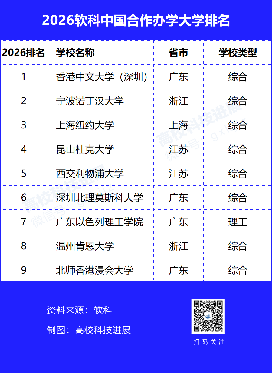 2026软科中国合作办学大学排名的对象有9所,香港中文大学(深圳)、宁波诺丁汉大学、上海纽约大学位列前三。
