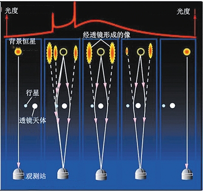 虽然观测困难,天文学家却发现微引力透镜在寻找地外行星方面可以大显身手。当恒星质量级天体从背景天体前通过时,微引力透镜会让背景天体在短暂的时间内看起来更亮,反映在光度变化曲线上是一个凸起的波峰。但如果观测到的光度变化曲线上出现不止一个波峰,那么说明恒星的附近还有其他小质量天体,比如行星。利用这种特征,可以判断地外行星的存在,分析它的质量以及与恒星距离等参数,即使望远镜中从没出现过这颗行星。