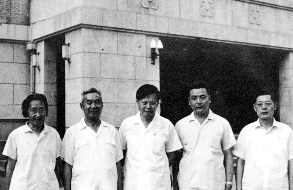 1972年杨振宁与王承书(左一)、张文裕(左二)、邓稼先(右二)、周光召(右一)于北京。(清华大学供图)