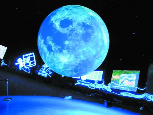 世界气象馆的巨大球体显示出的月球影像,由“嫦娥一号”卫星拍摄的月球照片合成。