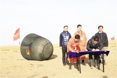 4月18日,工作人员在回收现场进行返回舱签字交接。新华社发(蔡新敏摄)