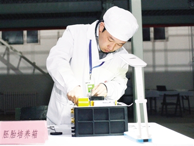 研究人员在打开实践十号搭载的胚胎培养箱。新华社记者 王全超摄