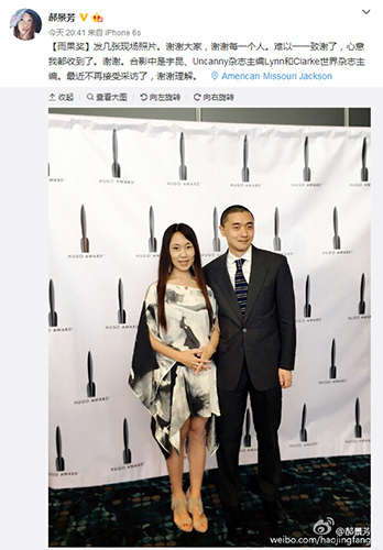 郝景芳在其微博上转发了自己发表获奖感言的视频。