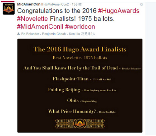 资料图:当地时间2016年4月26日,雨果奖各项提名名单公布。图为雨果奖官方推特截图。