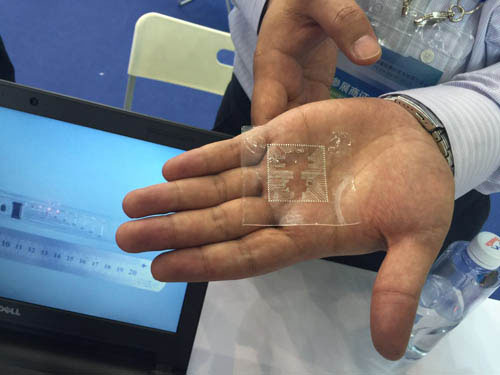 液态金属桌面电子电路打印机打印出的柔性电路板。赵竹青摄