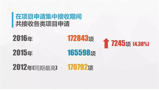2016年,在项目申请集中接收期间,共接收各类项目申请172843项,超过此前同期申请量最高的170792项(2012年),比2015年同期(165598项)增加7245项,增幅4.38%。