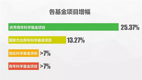 优秀青年科学基金项目增幅25.37%,国家杰出青年科学基金项目增幅13.27%,地区科学基金项目、青年科学基金项目的增幅也均超过7%。