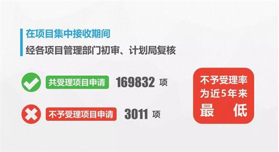 在项目集中接收期间,经各项目管理部门初审、计划局复核,共受理项目申请169832项,不予受理项目申请3011项,占申请总数172843项的1.74%,不予受理率为近5年来最低。