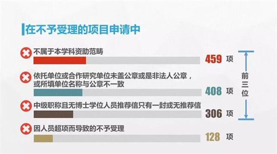 在不予受理的项目申请中,“不属于本学科资助范畴”(459项)、“依托单位或合作研究单位未盖公章或是非法人公章,或所填单位名称与公章不一致”(408项)、“中级职称且无博士学位人员推荐信只有一封或无推荐信”(306项)为数量前3位的原因。因人员超项而导致的不予受理申请数128项,比2015年的173项进一步下降。