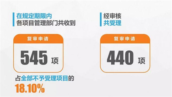 在规定期限内,各项目管理部门共收到复审申请545项,占全部不予受理项目(3011项)的18.10%。经审核,共受理复审申请440项。