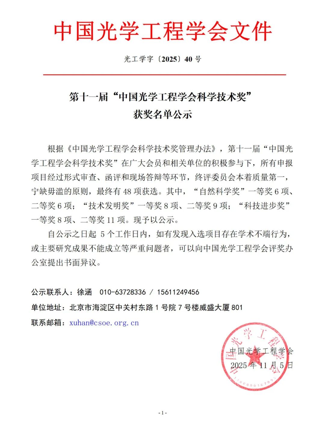第十一届“中国光学工程学会科学技术奖”获奖名单公示