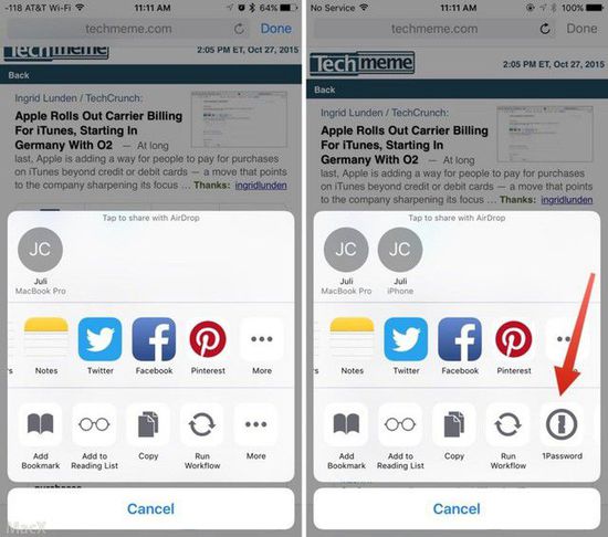 在Hipchat应用打开网页后,看到右侧iOS 9.2截图中包含1Password插件,左侧iOS 9.1截图中不支持(图片来自MacX)