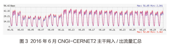 6月CNGI-CERNET2主干网流量相比5月略有增长,6月入流量均值为29195.216Mbps,相比5月增加了4.44%,与2015年同期相比减少了17.40%;6月CNGI-CERNET2出流量均值为31762.323Mbps,环比增加了3.77%,与2015年同期相比减少了13.97%。