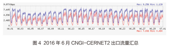 6月CNGI-CERNET2出口流量与5月相比略有降低。6月入流量月峰值为9.256Gbps;出流量峰值7.936Gbps。