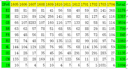 4月全球IPv6地址申请(/32以上),总计有360个,其中欧洲139个,拉美128个,亚太62个,北美26个,非洲5个,分别来自56个国家/地区。申请个数最多的是巴西,105个,其次是美国,27个。4月较大的申请,有一个/24来自西班牙。4月全球IPv6地址分配数量为1434*/32,其中分配地址数量最多的是西班牙,368*/32;其次是德国,116*/32。在过去的12个月,获得的IPv6地址数量最多的是英国,9504*/32;其次是德国,1357*/32。
