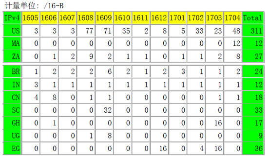 4月全球IPv4地址分配数量为77B,其中获得最多的是美国,48B;其次是摩洛哥,12B。4月,除亚太、欧洲、拉美、北美等地区IPv4地址已耗尽外,非洲地区也在月初宣布进入IPv4地址耗尽第一阶段。各地区IPv4地址消耗情况,参见表1。在过去的12个月,美国获得的IPv4地址最多,共计311B, 其次是埃及,36B。