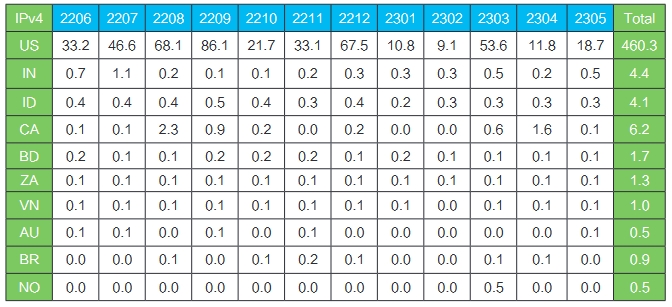 表1 近12个月IPv4地址新增数最多的国家/地区(单位:/16-B)