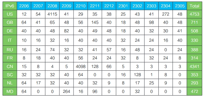 表2 近12个月IPv6地址新增数最多的国家/地区(单位:/32)