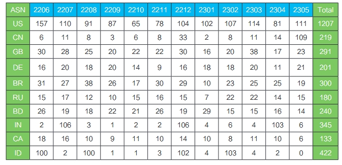 表3 近12个月ASN号码新增数最多的国家/地区(单位:个)