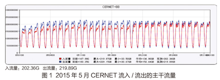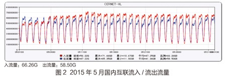 2015年5月CERNET主干网网络运行正常。这段时间随着用户的增加,CERNET主干流量、国内互联流量较4月均有大幅度提升,与去年同(133.54G,158G)相比,入流量增68.82G,出流量增61.89G。