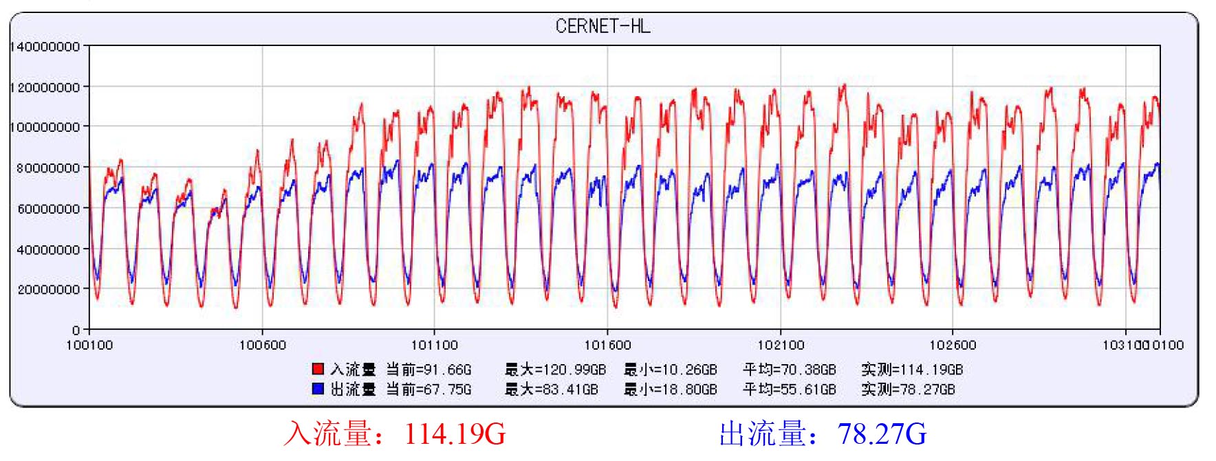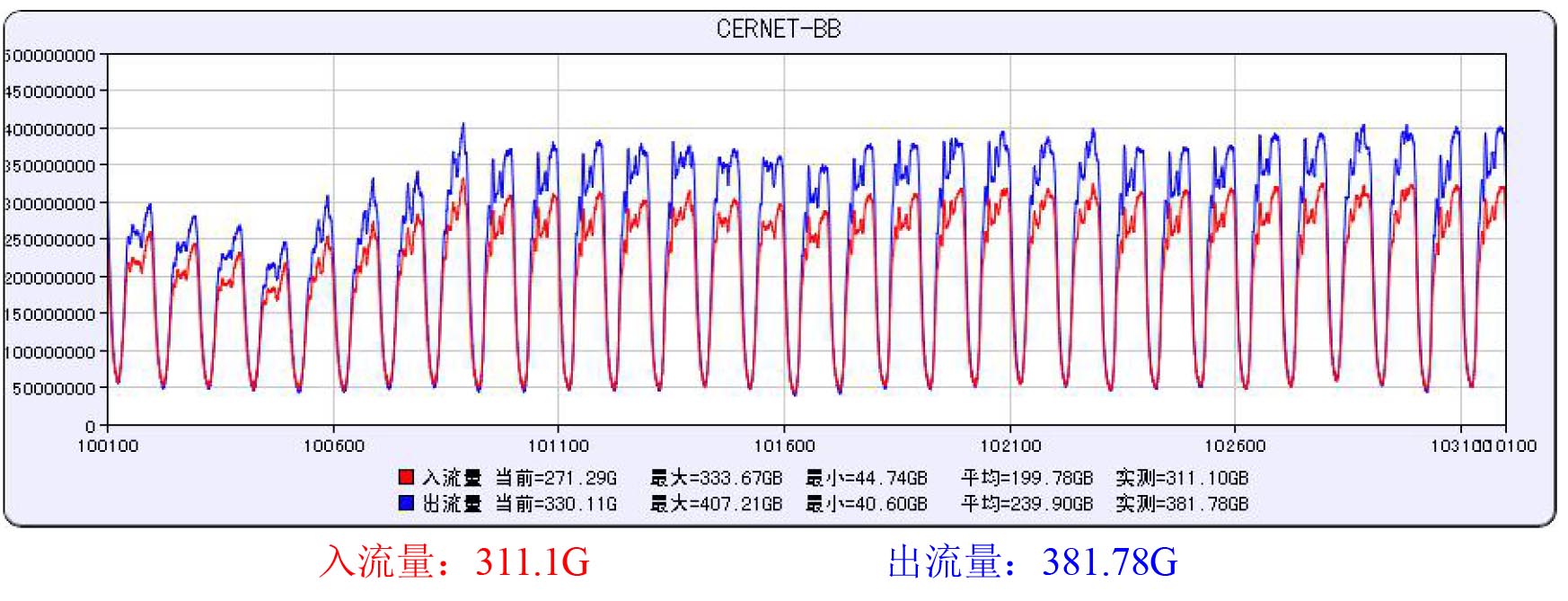 2017年10月CERNET主干网网络运行正常。CERNET主干网流量相比于9月变化不大,从主干网的流入、流出流量来看,相比于9月入流量增加了4.53G,出流量增加11.27G;从国内互联流入/流出来看,相比于9月入流量增加了8.03G,出流量减少了7.61G;从国际互联流入/流出流量来看,相比于9月入流量增加了0.83G,出流量减少了0.97G。从CERNET主干网流量对比来看,全国十大地区中心中入方向流量清华居首,华中次之,华东北地区位列第三;出方向流量是清华则第一,华中地区第二,东北地区第三位。
