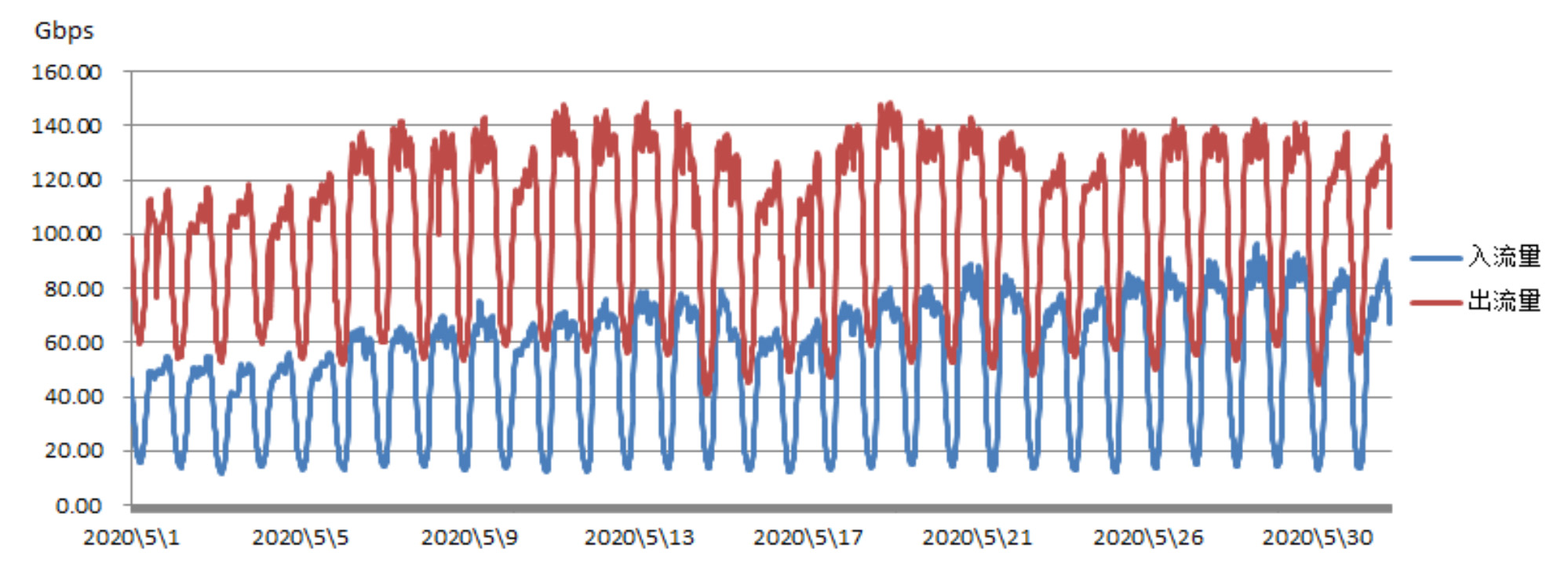 5月CERNET主干网总流量相比4月有所增加,主要原因是部分高校毕业年级开学,用户流量增加。主干网总流量相比于4月增加了117.07G;国内互联互通总流量相比于4月增加了30.72G;国际互联总流量相比于4月增加了6.91G。相比往年,主干网总流量较低,国内互联入方向流量较低,这些主要是受新冠肺炎疫情的影响导致。疫情期间网络我们重点保障了远程视频会议应用的访问,并根据用户申请需求为用户免费升级保障带宽。