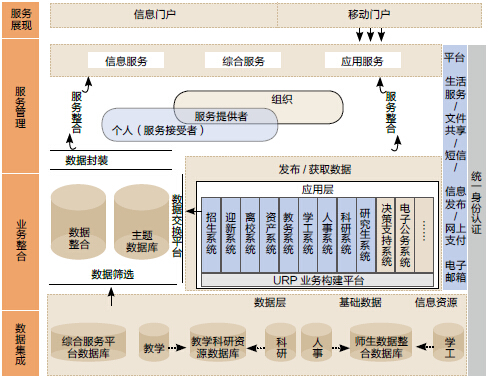 “一站式”服务是高校管理和服务的发展趋势,也是信息化服务概念的延伸和信息化助力校务改革和发展的具体表现。复旦大学在十多年信息化校园建设成果的基础上,根据用户类别和业务周期重新规划信息化业务流程,基于数据集中实施数据分析和利用,整合跨部门业务,抽取共性服务,建立适应用户习惯和新媒体的门户应用,形成了一个集信息服务、应用服务和综合统计服务“三位一体”的“一站式”服务平台。