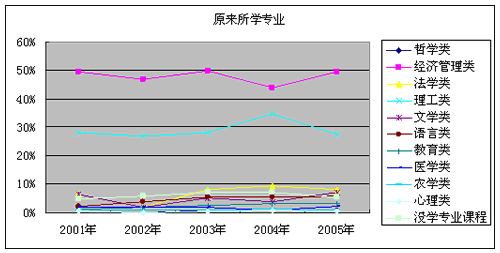 从2001年到2005年,原来所学专业是经济管理类的学生所占比例一直最高,从2001年的49.46%到2005年的49.4%,没有太大波动。