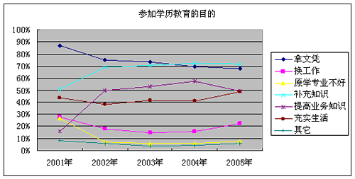 2001年,86.84%的网络大学生以拿文凭为主,其次50.75%的网络大学生是以补充知识为主。从2001年到2005年,以拿文凭为主的网络大学生比例呈下降趋势,到2005年下降为67.73%,以补充知识为主的网络大学生比例呈上升趋势,到2005年上升为71.81%。