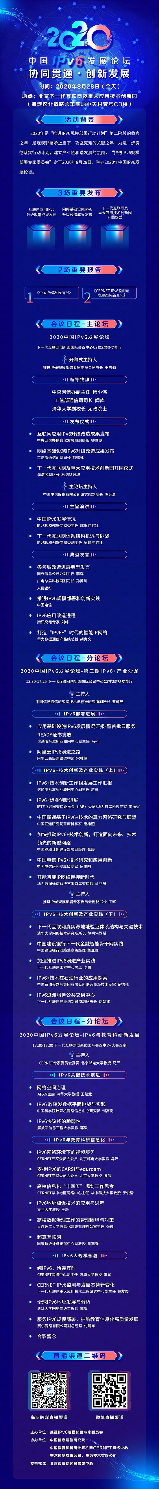 8月28日,由“推进IPv6规模部署专家委员会”主办,中国信息通信研究院、CERNET网络中心、赛尔网络有限公司和华为技术有限公司协办的“2020中国IPv6发展论坛”将在北京下一代互联网及重大应用技术创新园举行。