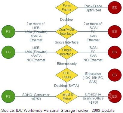 IDC个人存储产品(PS)与企业级存储产品(ES - Enterprise Storage)的区分模型如下: