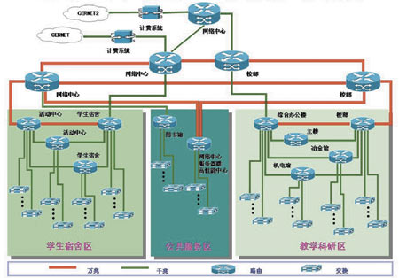 主干网节点采用万兆多环形结构,通过Cisco 7609独立光纤1Gbps上联CERNET网络,通过Cisco 12404独立光纤1Gbps上联CNGI-CERNET2网络。