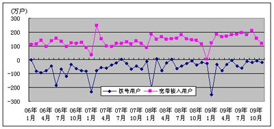 3.互联网用户:基础电信企业的互联网用户进一步趋向宽带化。1-11月份,基础电信企业净增互联网宽带接入用户1917.6万户,达到10205.5万户,而互联网拨号用户减少了351.6万户。
