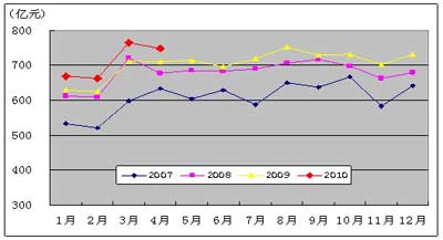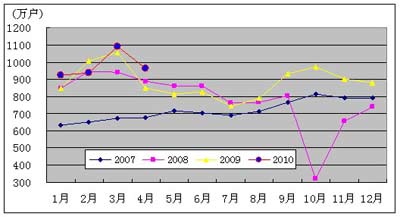 图3. 2007-2010年移动电话用户各月净增比较