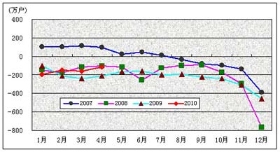 图2. 2007-2010年固定电话用户各月净增比较