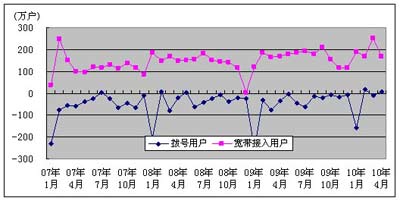 3.互联网用户:基础电信企业的互联网用户进一步趋向宽带化。2010年1-4月,基础电信企业互联网宽带接入用户净增779.5万户,达到11102.0万户,而互联网拨号用户减少了158.0万户。