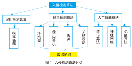 数据挖掘是指从大量的、不完全的、有噪声的、模糊的、随机的数据中提取隐含在其中的、人们不知道的但又是潜在有用的信息和知识的过程。这一点与异常检测所要求的对未知入侵和威胁的检测是相一致的。随着数据挖掘算法的发展,其在入侵检测领域中的应用愈加深入,受到人们研究的关注。当前流行的数据挖掘技术是异常检测算法研究的主要领域,如图1所示,其中以关联规则、聚类和支持向量机等算法尤其具有代表性。下面就各种有代表性的算法进行介绍。
