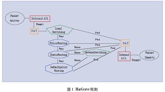 随着网络规模的变化,防火墙或网络设备的配置随着不断增加的改变越来越复杂,即使是资深的网络管理员,有时候也会发现在一番复杂的防火墙配置后,自己的服务器仍然不能访问外网或者不能被外网访问,规则看了很多遍,却不知道是哪里出了问题。有一个自动化的工具来帮助网络管理员发现问题一直是网管们的梦想,来自伍斯特理工学院(Worcester Polytechnic Institute)的Timothy Nelson等人就专门开发了一个开源工具Margrave来解决这个问题。Margrave 是一个用于防火墙分析的工具,提供了枚举规则修改后果、发现冲突规则、为防火墙的行为跟踪到具体执行规则以及验证安全目的与规则等多项功能。与传统的防火墙规则分析工具不同,Margrave提供了多种不同层次的分析:从规则、过滤器、防火墙到网络。Margrave支持现实中网络防火墙的配置语言(例如思科的IOS),并从这些配置中提取出NAT、路由、IP ACL设置,如图1所示。当管理员发现问题时,可以向配置规则查询,期望通过的报文是被哪一条具体的规则所丢弃,或期望被丢弃的报文被哪一条报文所接受。这样管理员就可以迅速定位到问题发生的地点。有兴趣的读者可以访问http://www.cs.brown.edu/research/plt/software/margrave/来试试这个工具。