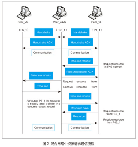 在P2P通信过程中,P4_1、P6_1和P46_1定时向Tracker_v4v6发送更新消息,告知进度。具体通信流程如图2所示。Peer_v6向Peer_v4v6发送数据中转请求的情况与之类似,不再赘述。