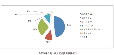 由于仍在暑假期间,大部分的投诉事件数量有所减少,但是与网站安全有关的事件仍在高位数运行,这些网站的漏洞信息主要来源于目前比较红火的各类安全众测项目,这些项目依托众测平台及大量对安全感兴趣的人对各类网站目标进行的安全检测。由于安全爱好者里不乏在校的大学生,所以测试目标有很多都是高校的网站,也因此能检测出很多高校网站的漏洞。近期没有新增影响范围广且危害严重的木马病毒。