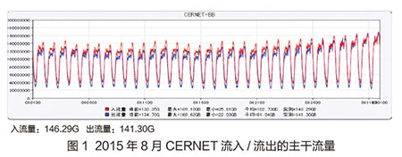 正值暑假,8月CERNET主干网流量相比于7月有明显下降,从主干网的流入、流出流量来看,相比于7月入流量减少了40.97G,出流量减少了43.36G;从国内互联流入/流出来看,相比7月入流量减少了13.01G,出流量减少了16.92G;从国际互联流入/流出流量来看,相比7月入流量减少了4.56G,出流量增加了2.09G。