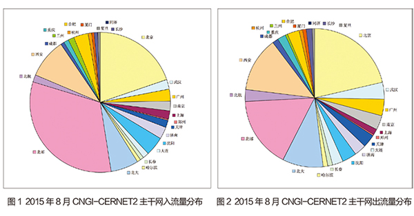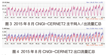 因正值暑假,故8月CNGI-CERNET2主干网流量为全年较低水平。8月入流量均值为10658.762Mbps,相比7月减少了41.30%,与2014年同期相比减少了46.05%;8月CNGI-CERNET2出流量均值为11759.34Mbps,环比减少了40.36%,与2014年同期相比减少了40.96%。