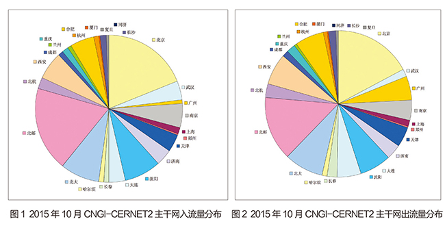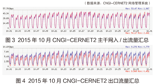 10月CNGI-CERNET2主干网流量相比9月有小幅度提升,10月入流量均值为29129.07Mbps,相比9月增加了15.50%,与2014年同期相比减少了9.14%;10月CNGI-CERNET2出流量均值为31002.114Mbps,环比增加了14.85%,与2014年同期相比减少了8.10%。