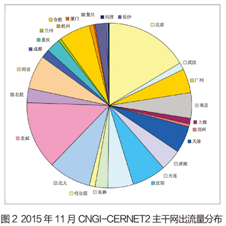 从11月的出流量分布图2来看,北京节点出流量为最高,其流量为5552.128Mbps,占到总出流量的16.30%;其次是北邮节点,占到总出流量的13.51%;流量排名第三位的是北大节点,其占总出流量的8.14%。